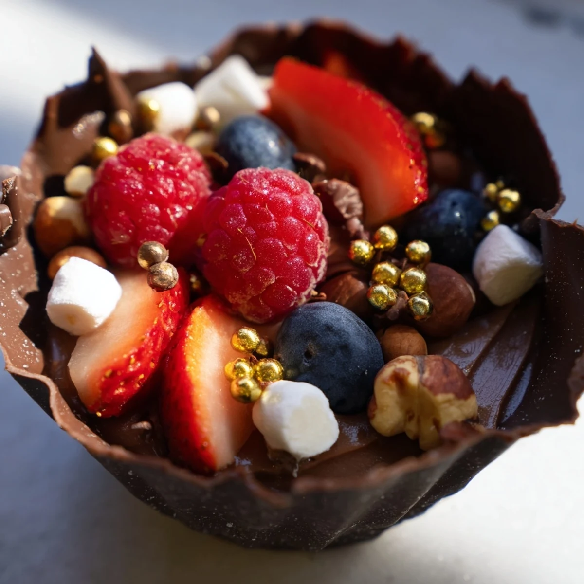Create stunning individual chocolate cups filled with silky dark chocolate mousse and adorned with fresh mixed berries, crunchy nuts, and decadent toppings. These impressive handheld desserts feature homemade chocolate shells crafted from melted dark chocolate, filled with a whipped cream-based mousse that balances sweetness with intense cocoa flavor. The interactive grazing-style presentation lets guests enjoy multiple textures and flavors in each bite, from smooth mousse to juicy berries to crisp nuts. Ideal for entertaining, these elegant cups can be prepared ahead and chilled until ready to serve.