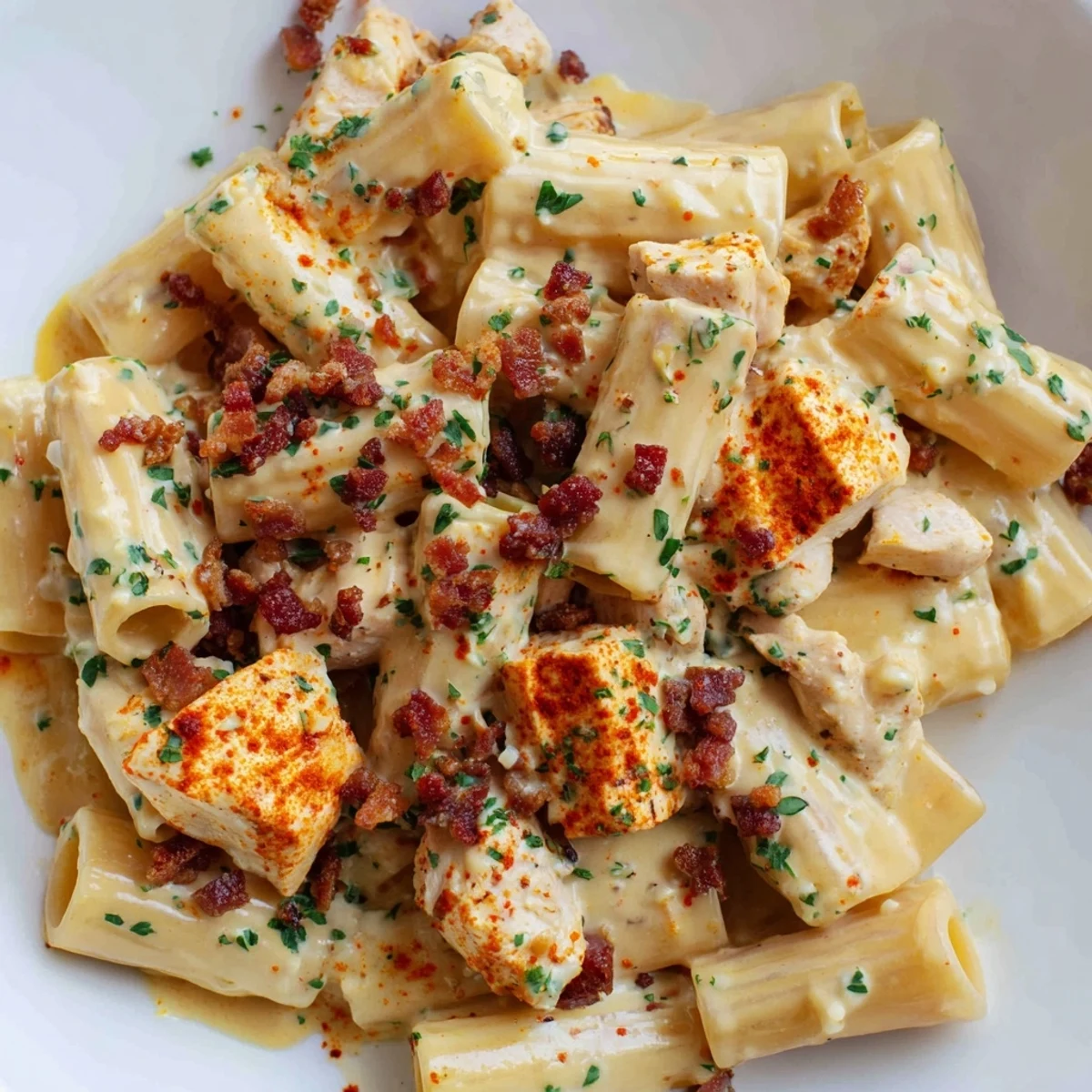 Indulge in this irresistible pasta dish that combines tender seasoned chicken with a velvety smooth cream cheese and cheddar sauce. The crispy beef bacon adds a savory crunch while fresh parsley and chives brighten each bite. Ready in just 45 minutes, this comforting main serves four and delivers the perfect balance of rich, creamy, and crispy textures that make it an instant family favorite.