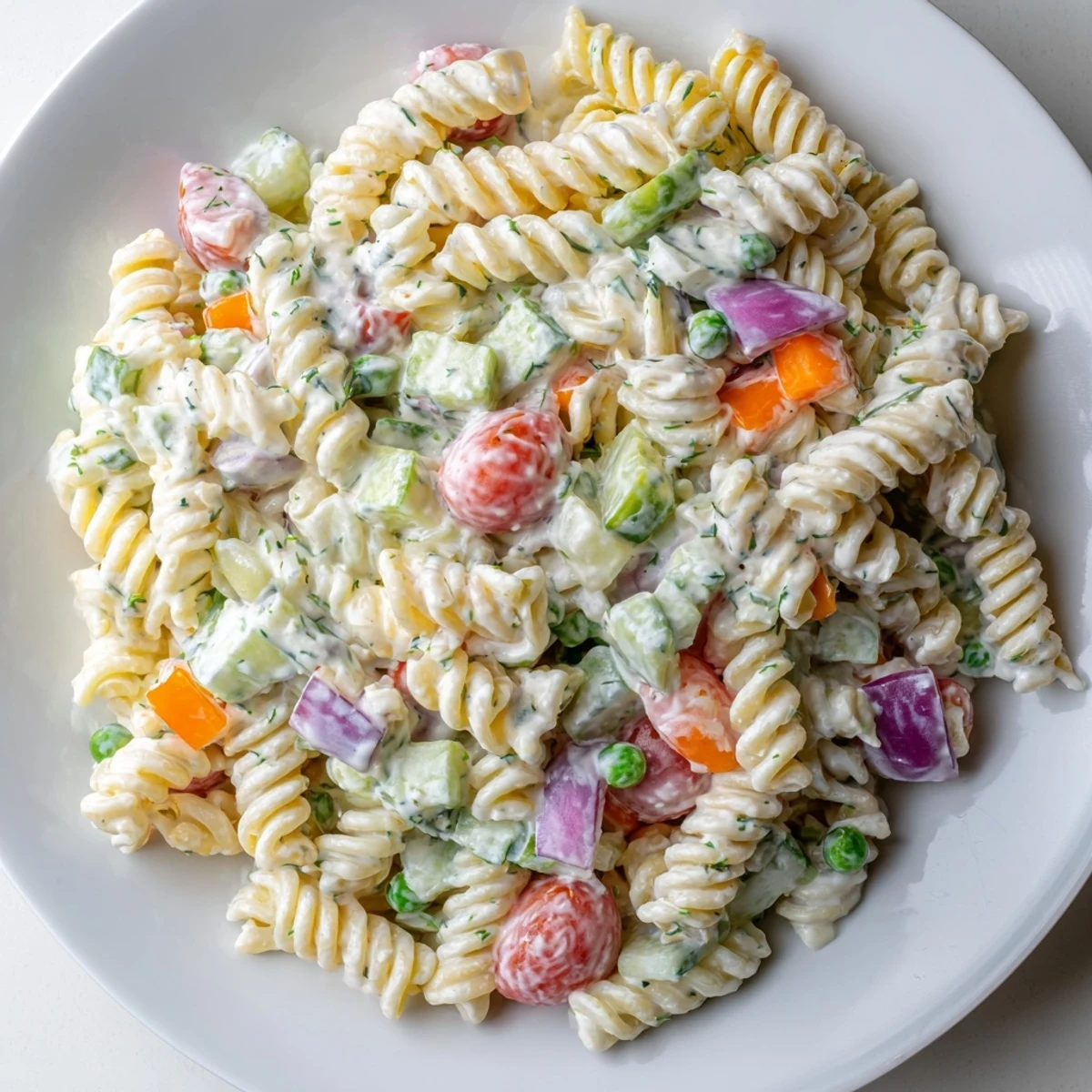 This creamy ranch pasta salad combines perfectly cooked rotini or penne with crisp cherry tomatoes, diced cucumber, red bell pepper, red onion, and sweet peas. The homemade ranch dressing blends mayonnaise, sour cream, and buttermilk with fresh dill, chives, and aromatic seasonings. Ready in just 25 minutes, this make-ahead dish gets even better after chilling, allowing flavors to meld beautifully. Add optional cheddar cheese or crispy bacon for extra richness, or substitute Greek yogurt for a lighter version.