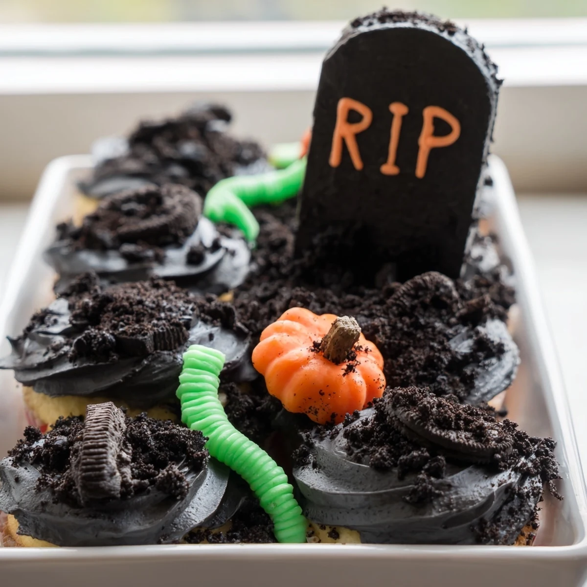 Bake the cupcakes up to two days ahead and store in an airtight container. Frost and decorate the graveyard scene the day of serving for best results. The cookie dirt and tombstone decorations can get soft if assembled too far in advance.