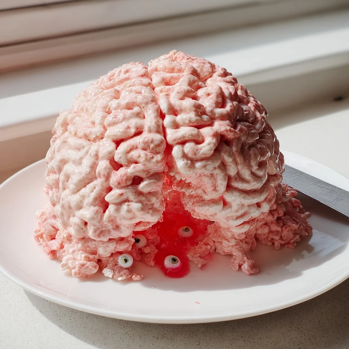The combination of pink or red food coloring mixed into the marshmallow coating gives the crispy rice its brain-like hue. You can enhance the effect by using gel food coloring for deeper tones and brushing additional details onto the finished surface.